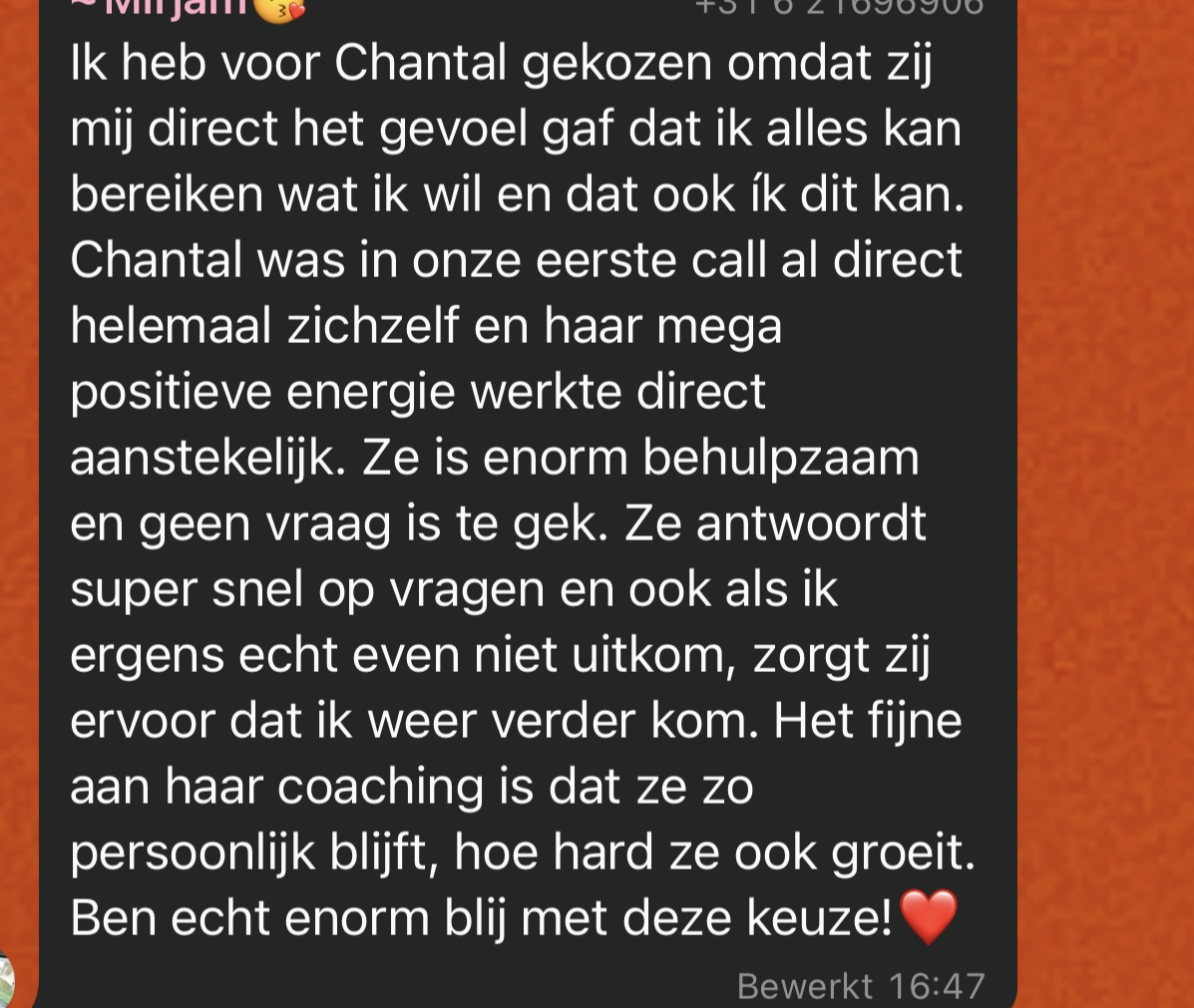 Vorig jaar kwam ik in contact met Chantal, en vanaf het eerste moment werd ik geraakt door haar energie en inspirerende, spontane uitstraling op Instagram. We hadden meerdere keren contact, en al snel wist ik: ik wil met haar één-op-één werken. Zelfs in onze eerste gesprekken hielp ze me al zo enorm goed op weg, dat ik dacht: als dit al zoveel oplevert, wat gaat een volledige coaching dan brengen?