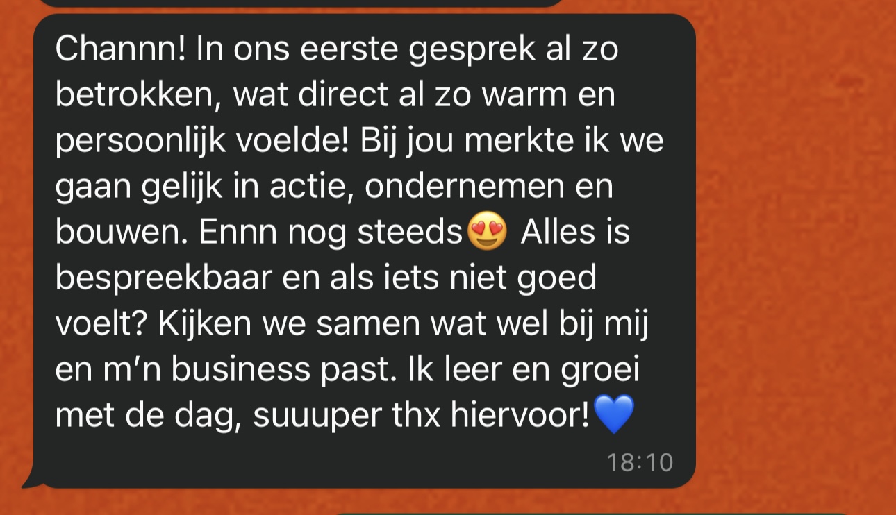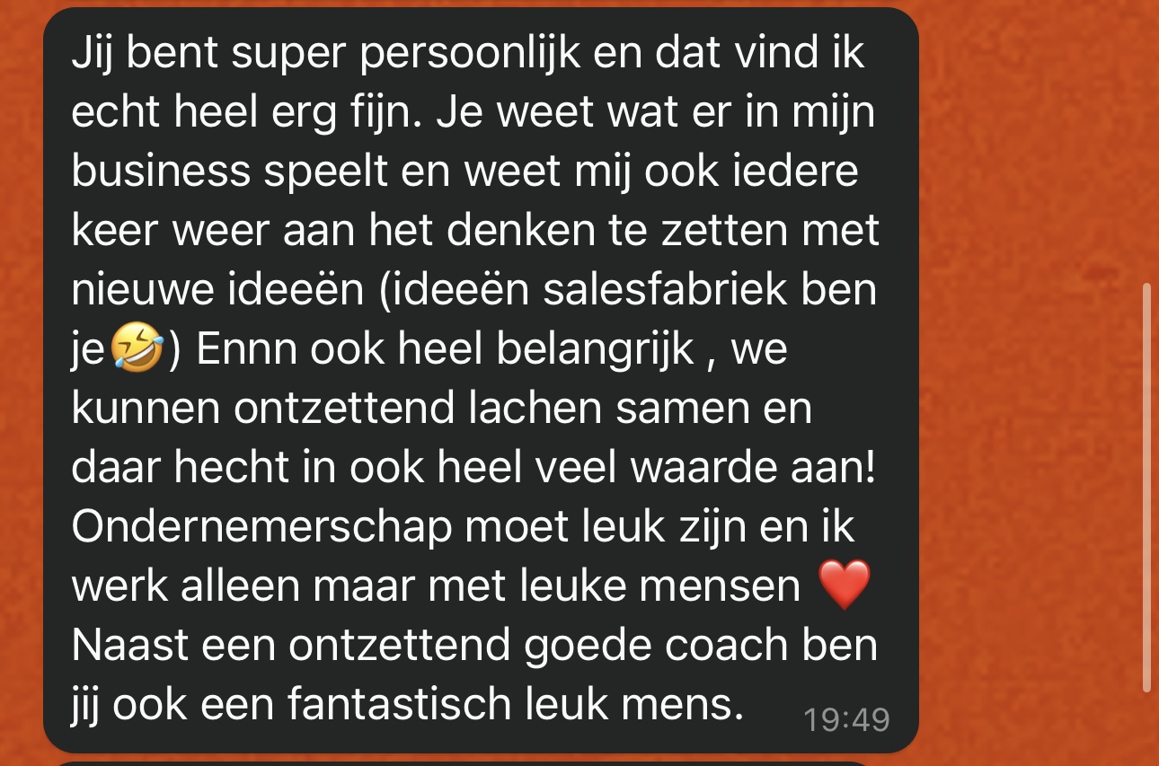 “Ik kan niet in woorden uitdrukken hoe dankbaar ik ben voor alles wat je het afgelopen jaar voor mij en mijn bedrijf hebt betekend. Dankzij jouw begeleiding en support ben ik weer gaan geloven in mezelf en mijn skills – en dat alleen al is onbetaalbaar.”